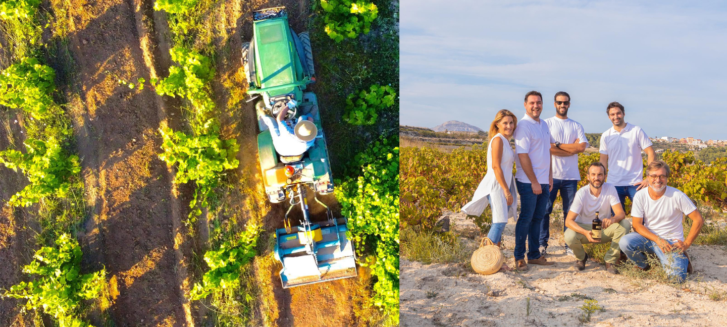 Viñedos que crecen sin riego artificial, en suelos arenosos o calcáreos que generan vinos vibrantes. La humedad de la noche y las brisas del día protegen sus cepas en equilibrio. Una viticultura orgánica rodeada de almendros y olivos, un ecosistema vivo.